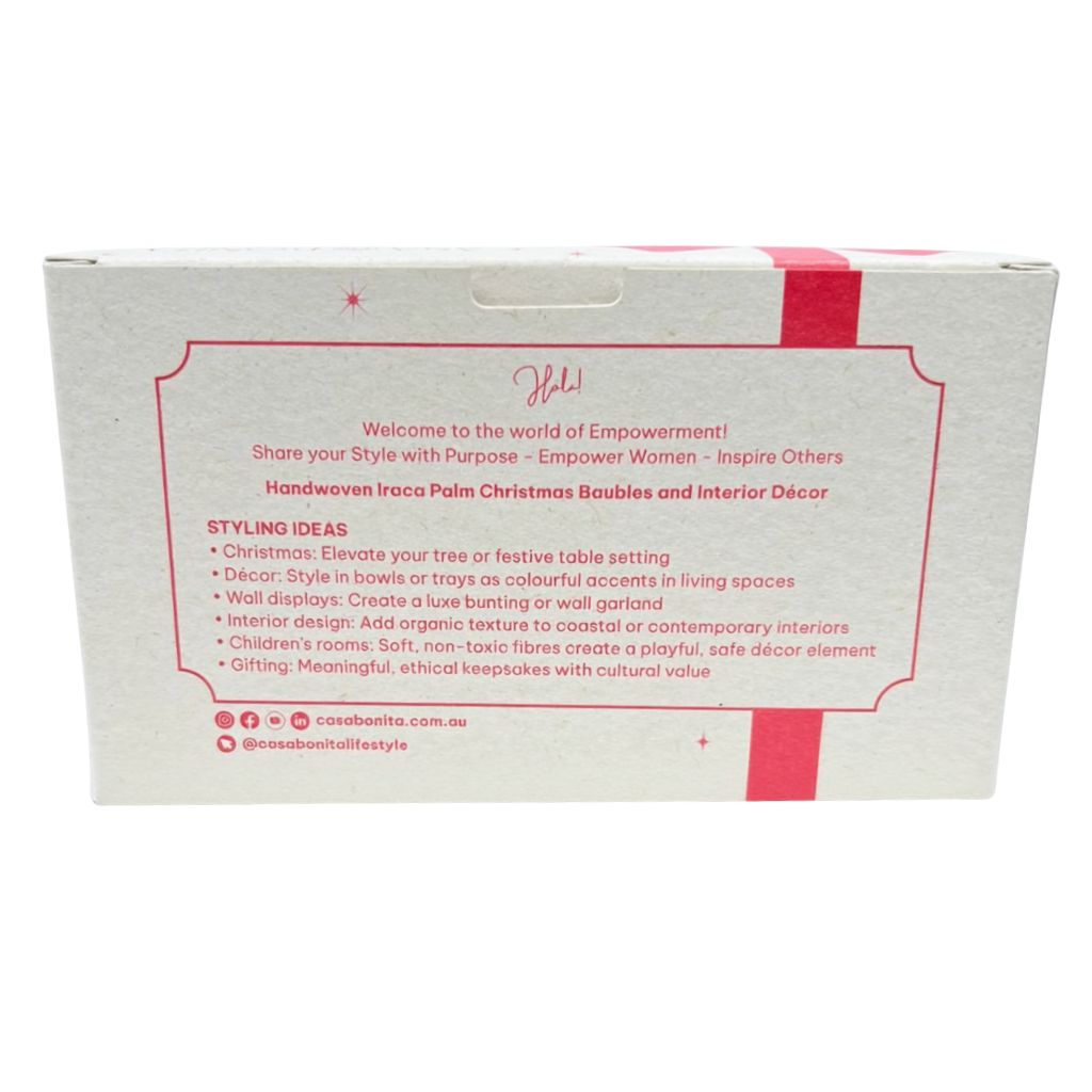 Add a touch of sustainable luxury and cultural heritage to your festive décor with this set of 2 handwoven Iraca Palm Christmas Baubles. Crafted by skilled Colombian artisans using natural fibres and dyes, each bauble brings vibrant colour, organic texture, and timeless style to your home.