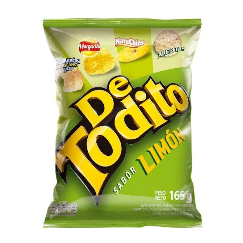 Enjoy the ultimate snack experience with Detodito Lime Flavour Chips, featuring a delicious combination of crispy Chicharrón Americano Pork Crackling, savoury Margarita Chips, crunchy Arepitas Chips, and zesty Natuchips Plantains. The bold lime flavour adds a refreshing kick to this perfect mix of textures and tastes.